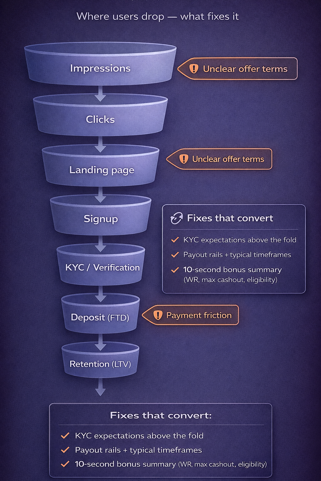 - GA4 event map: view_offer, click_cta, start_signup, complete_signup, first_deposit (FTD), withdrawal_attempt.
