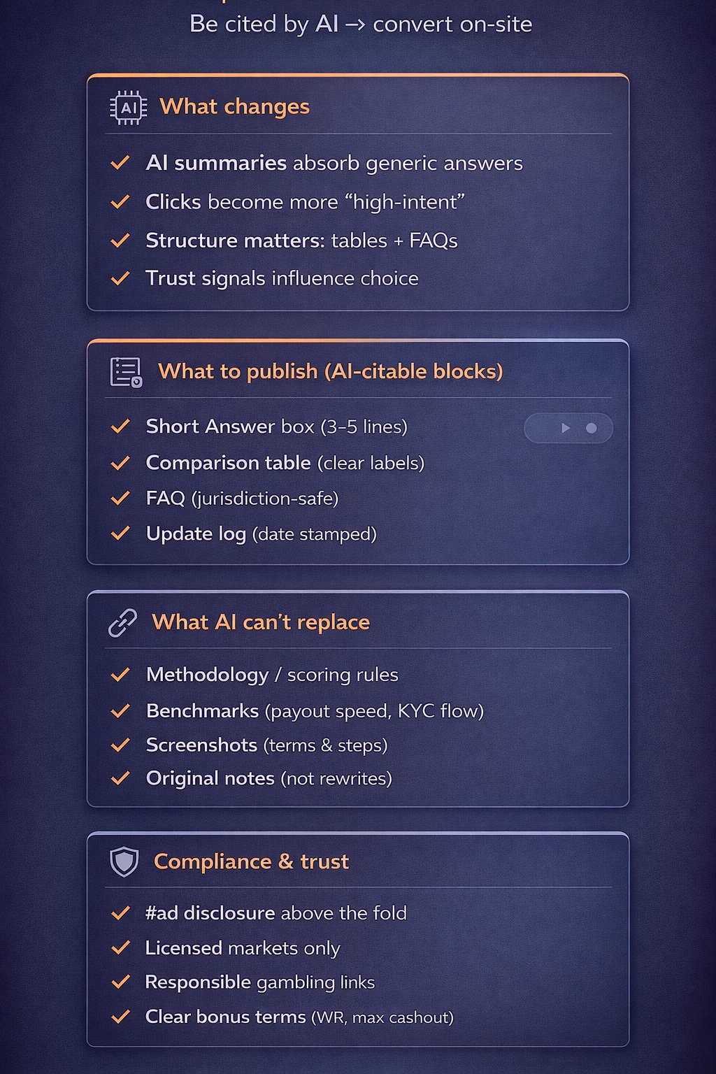 If your page is only a “generic answer,” AI summaries can satisfy the query without a click. So, you need to add assets AI can’t cheaply recreate: original scoring, verified screenshots, payout-speed benchmarks, KYC flow maps, and update logs. At the same time, your UX must convert the remaining clicks better — because you may get fewer of them.