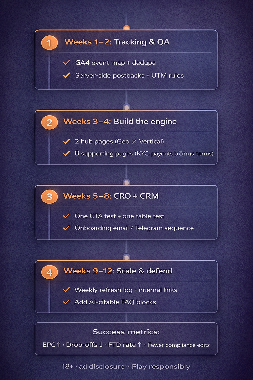 - Weeks 1–2: analytics cleanup + postbacks + content QA (facts log, compliance checklist).
