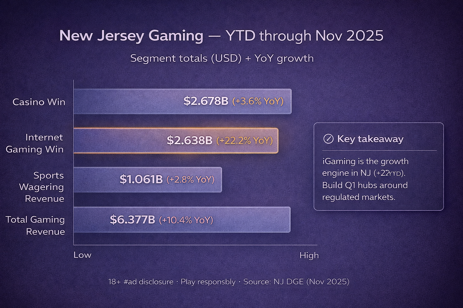 The NJ Division of Gaming Enforcement (DGE) reported Total Gaming Revenue of $636.2M for November 2025 (+14.2% YoY) and $6.38B year‑to‑date through November 2025 (+10.4% YoY). Most importantly for affiliates, Internet Gaming Win was $253.0M in November 2025 (+18.2% YoY) and $2.64B YTD through November 2025 (+22.2% YoY). Source: NJ DGE – November 2025 results (PDF).