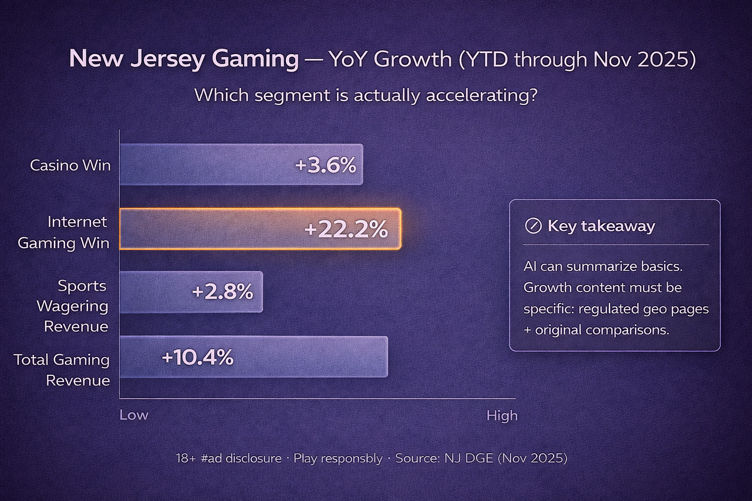 Updated: Jan 12, 2026 — The first weeks of 2026 hit iGaming affiliates with a “two‑front war”: (1) regulated market growth keeps pushing money into online products, while (2) AI search experiences reshape how traffic reaches you (and how often it does). This iGaming Affiliate AI Playbook 2026 gives you a data-backed snapshot (NJ, Ontario, UK) and then turns it into a 90‑day operating plan: what to publish, how to measure it, and how to stay compliant.