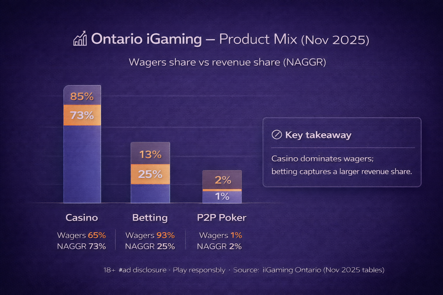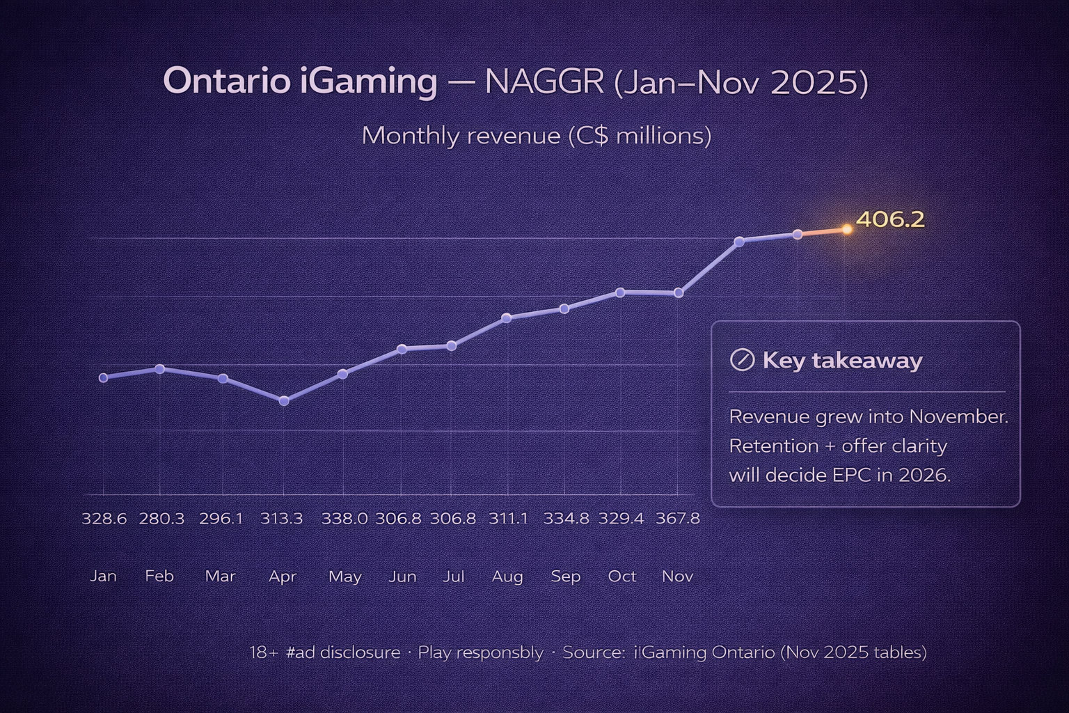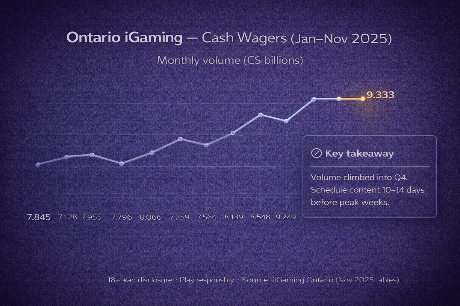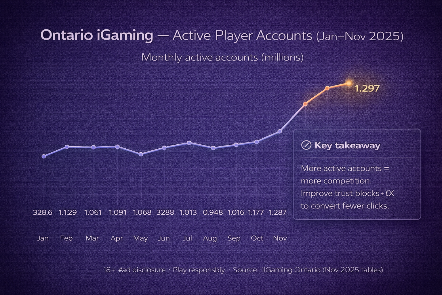Ontario’s regulated iGaming market continues to print scale. iGaming Ontario’s monthly market performance report (updated with data from November 2025) shows record-level activity and growing active accounts. Use it for two things: (1) market sizing (how big the pie is), and (2) product mix (where conversions typically come from). Official dataset hub: iGaming Ontario — Monthly Market Performance Report.