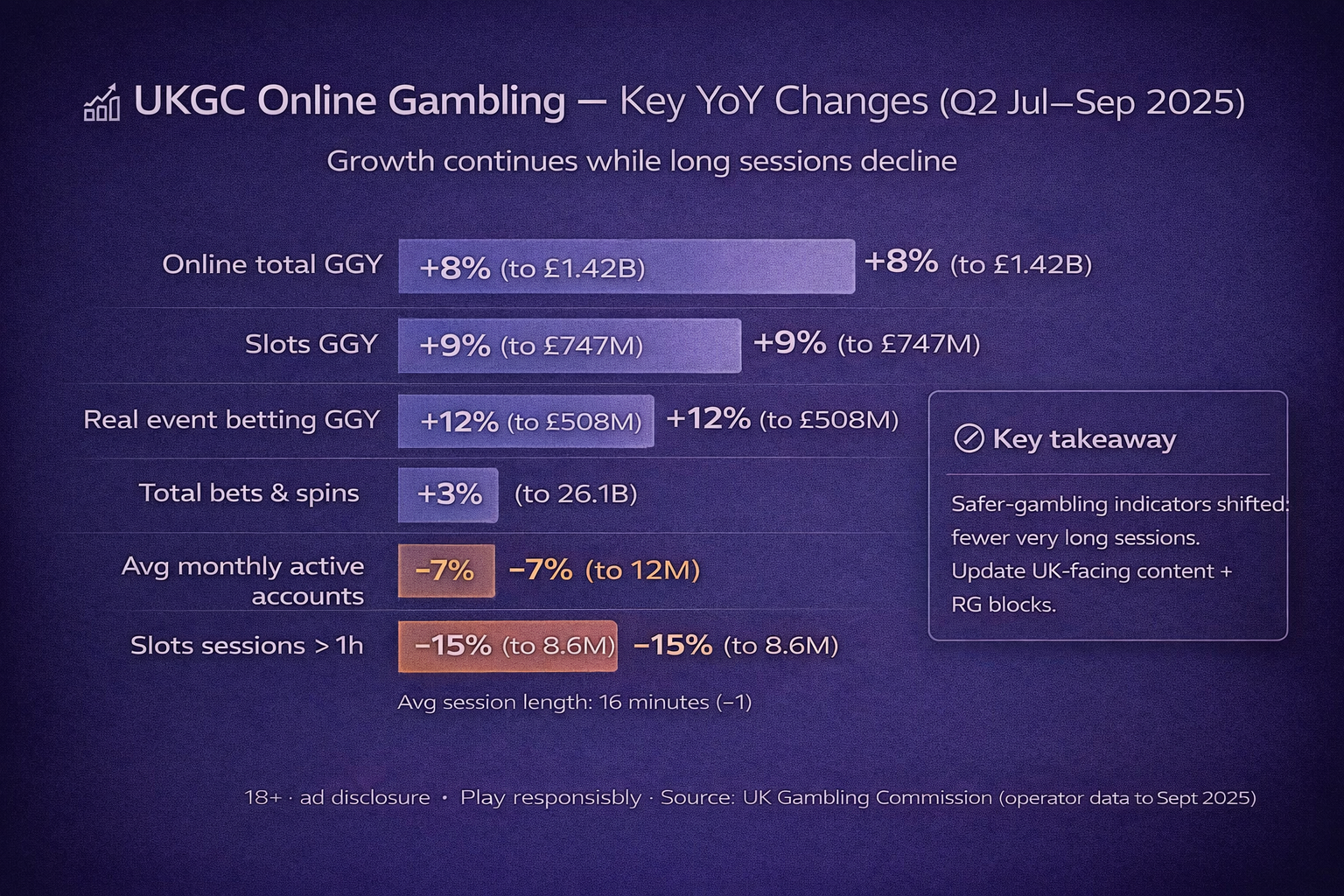 The UK Gambling Commission’s operator data to September 2025 highlights a key dynamic: even when total online activity grows, safer-gambling indicators can move in the opposite direction. In Q2 (Jul–Sep), online total GGY was £1.42B (+8% YoY) and slots GGY £747M (+9% YoY), while slots sessions lasting longer than an hour fell 15% YoY to 8.6M and average session length fell to 16 minutes. The UKGC also notes this was the second quarter after the online slots maximum stake limits went live (April/May 2025). Source: UKGC market impact data (operator data to Sept 2025).
