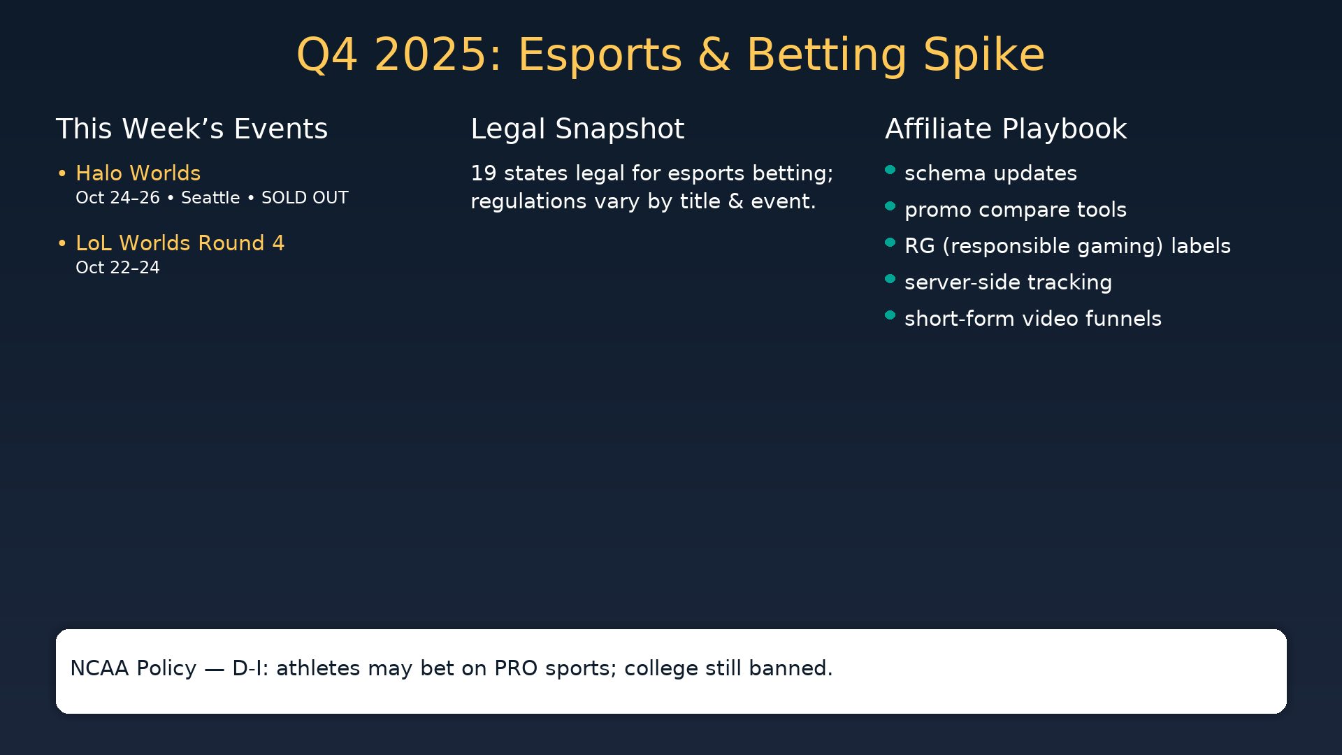 This October 2025 betting & affiliate news brief connects three fast‑moving stories your site can monetize right now: (1) the NCAA’s move to allow Division I athletes to bet on pro sports (college betting remains banned), (2) a packed esports week with Halo World Championship 2025 (Seattle, Oct 24–26) and LoL Worlds Round 4 (Oct 22–24), and (3) fresh operator tech launches in iGaming. We end with a copy‑paste checklist to turn this week’s traffic spikes into tracked revenue.